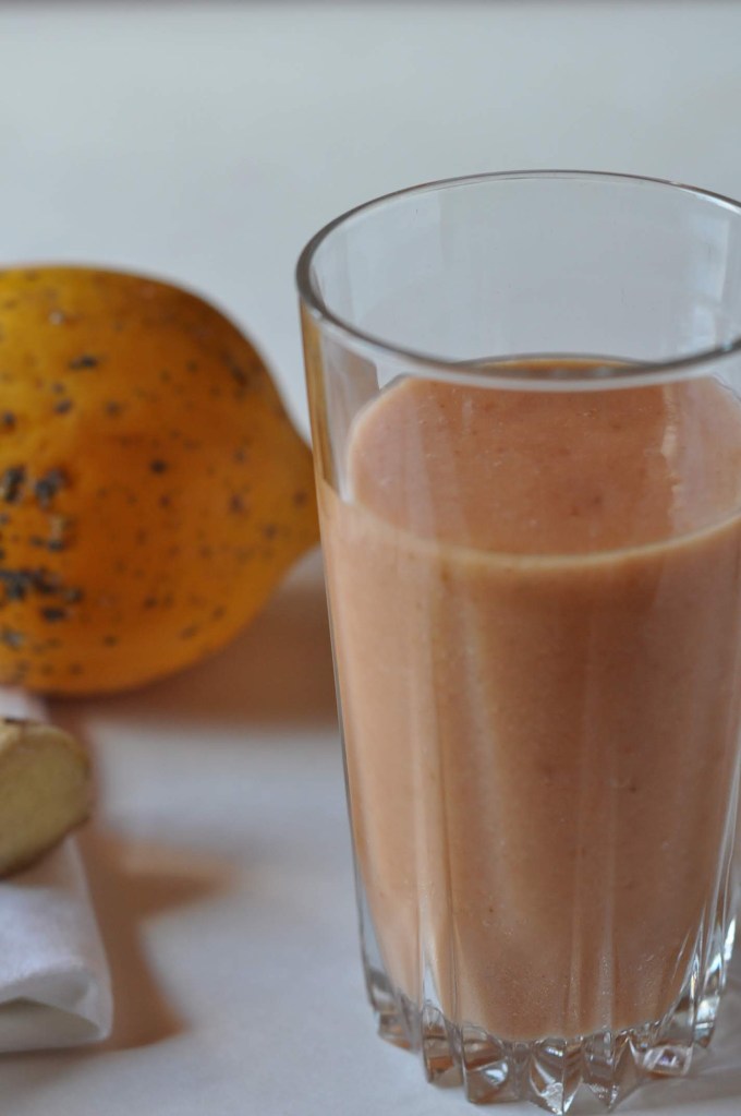 Peel skin from papaya and remove seeds. Peel ginger. Place all ingredients in blender and mix to desired consistency. I typically freeze my fruits as I like to enjoy this drink as a frozen smoothie.