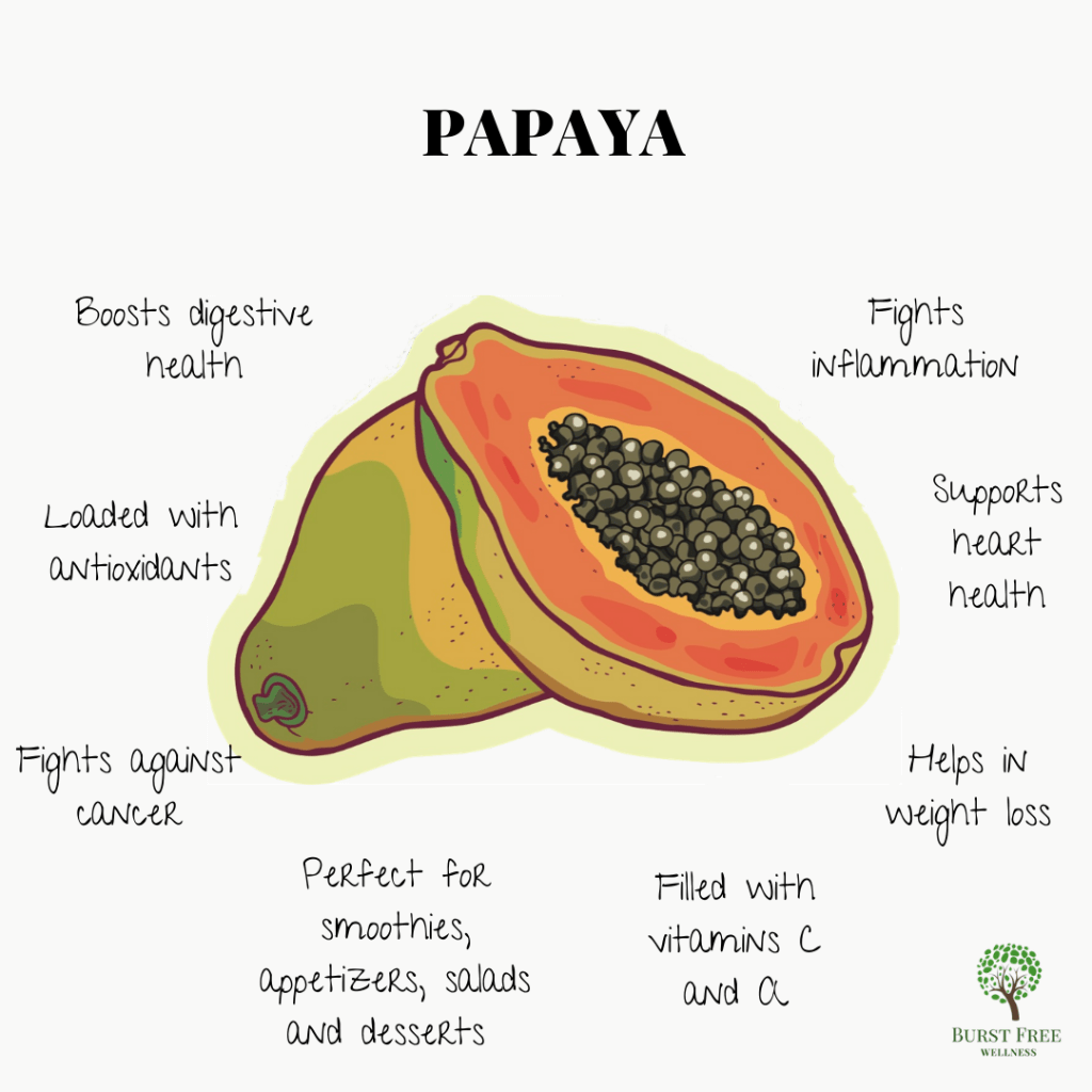 As you can imagine, there are many health benefits to eating papaya. A few of my favorite things about the papaya are it’s loaded with antioxidants and really helps to boost digestive health.